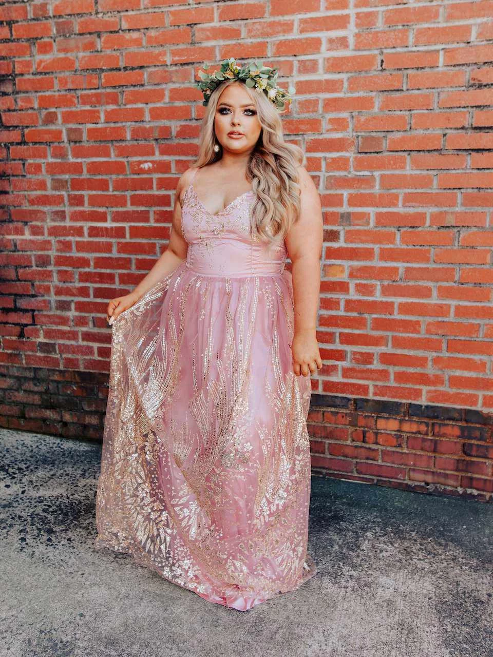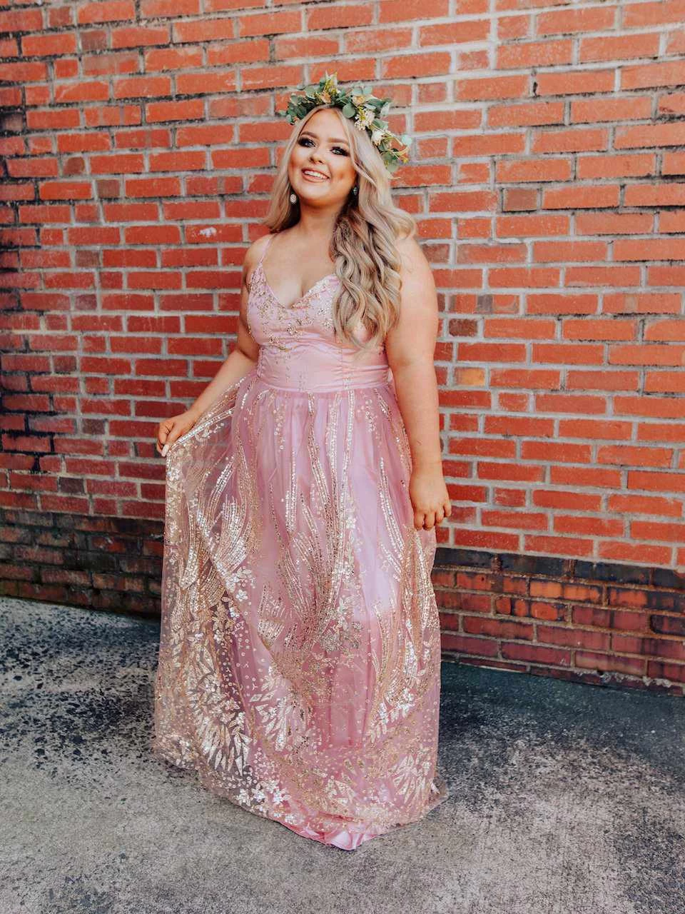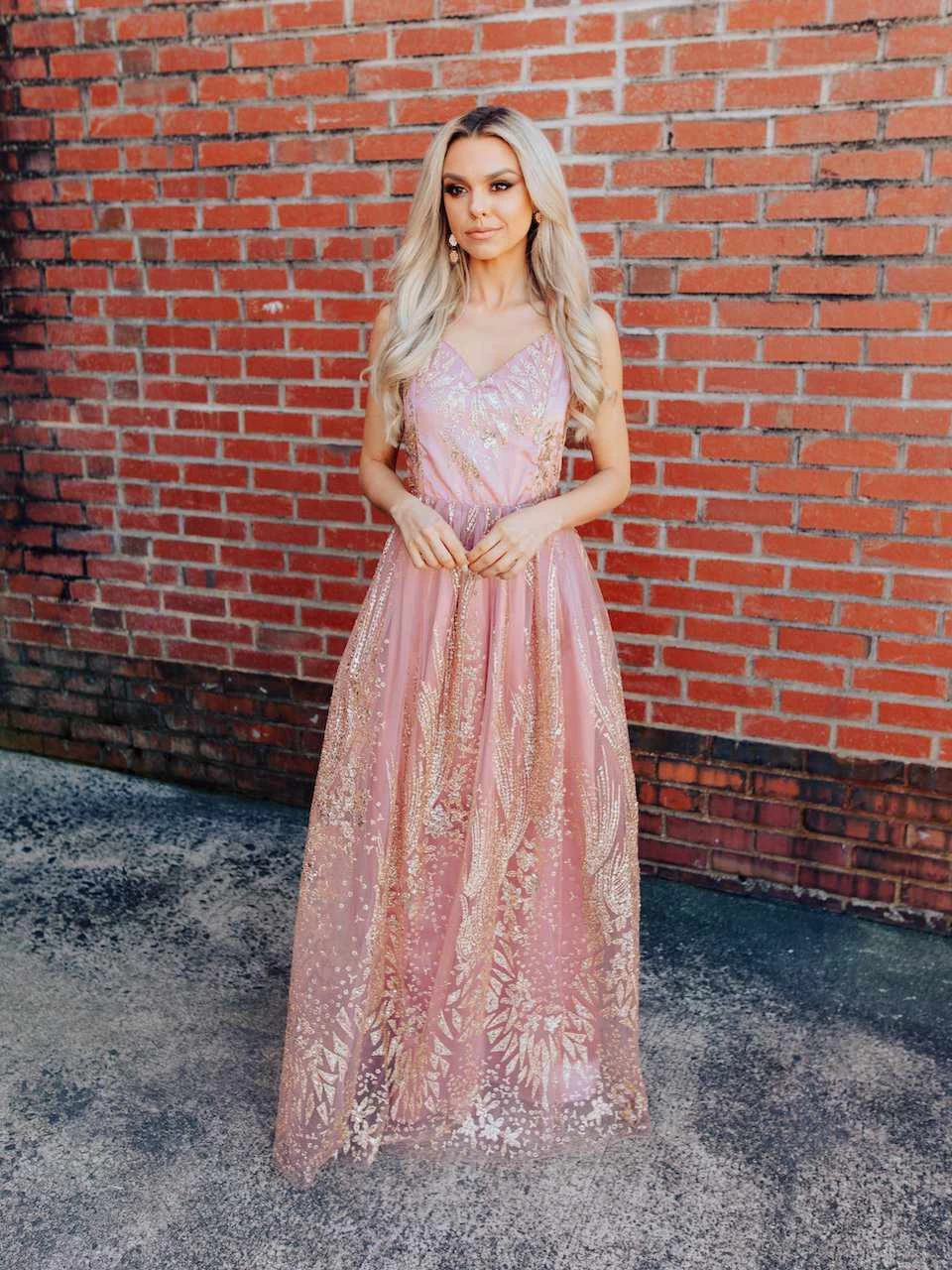 Show off your style as you adorn the patterns of gold throughout in the Turning Heads dress featuring adjustable spaghetti straps, a full length tulle skirt, and zipper back.Â