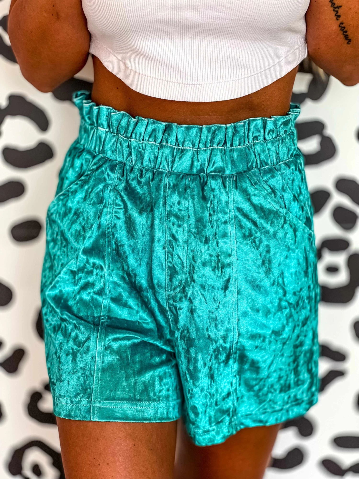 Stay comfy in the Vetiver Velvet Shorts. Perfect for a day out with your girls! These are going to be your casual shorts, but always staying in style! We love the ruffle feature. And, not to mention, these shorts have pockets! Easily dressed up or dressed down! True to size fit. Elastic waistband and stretchy material.Â