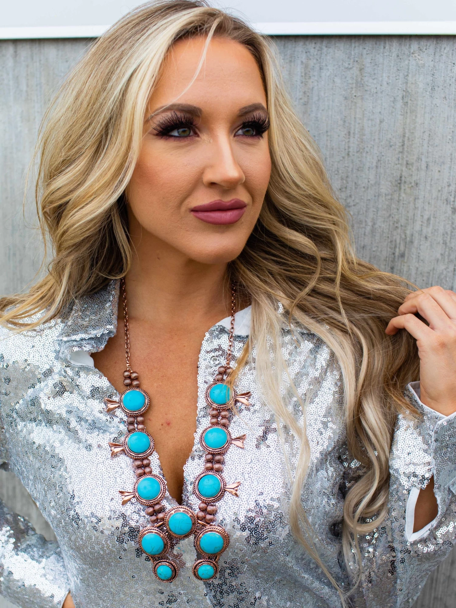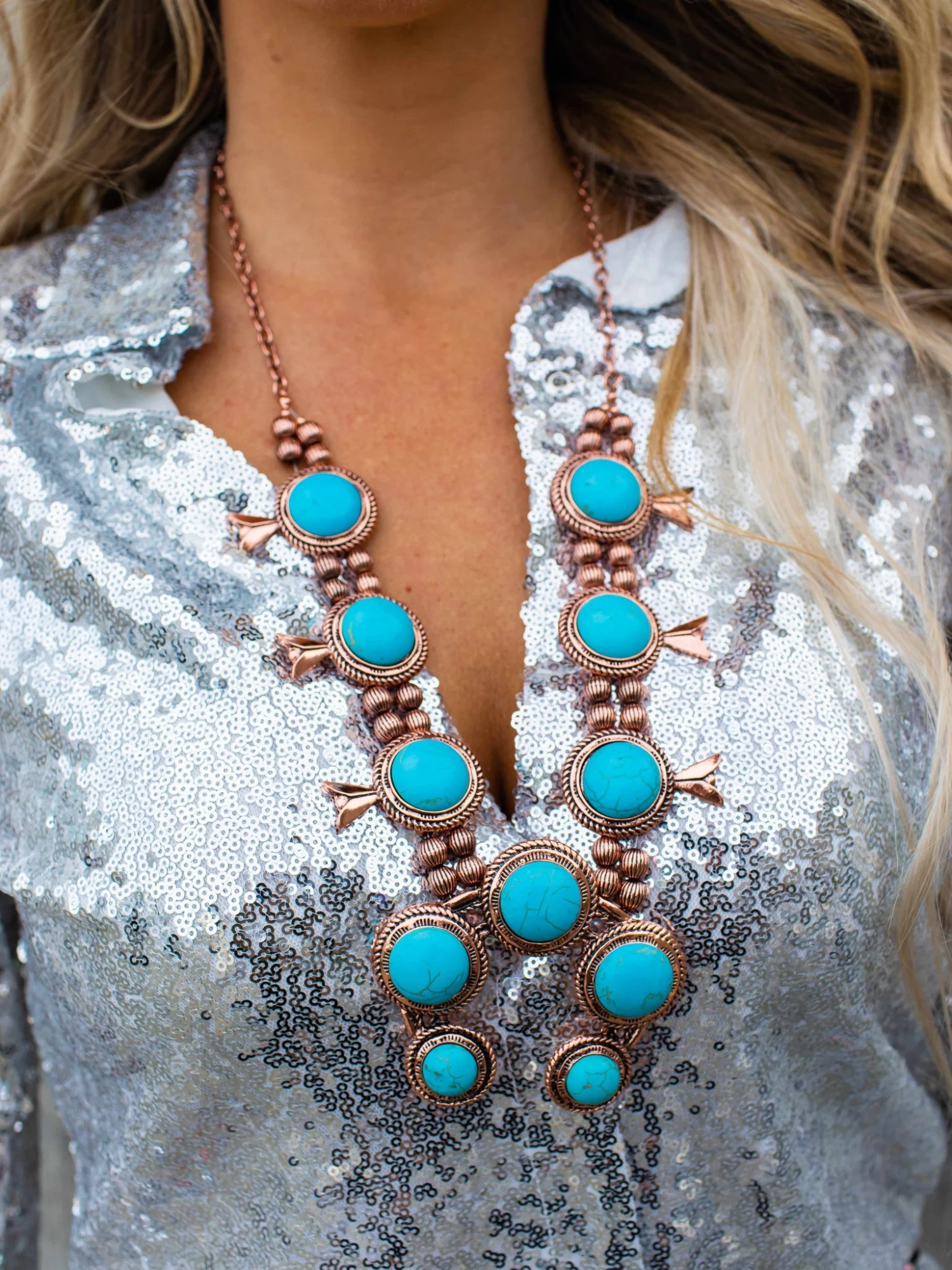 Can a girl ever have too much turquoise? This chunky copper necklace has vintage western vibes and no less than eleven genuine round turquoise stones!Â