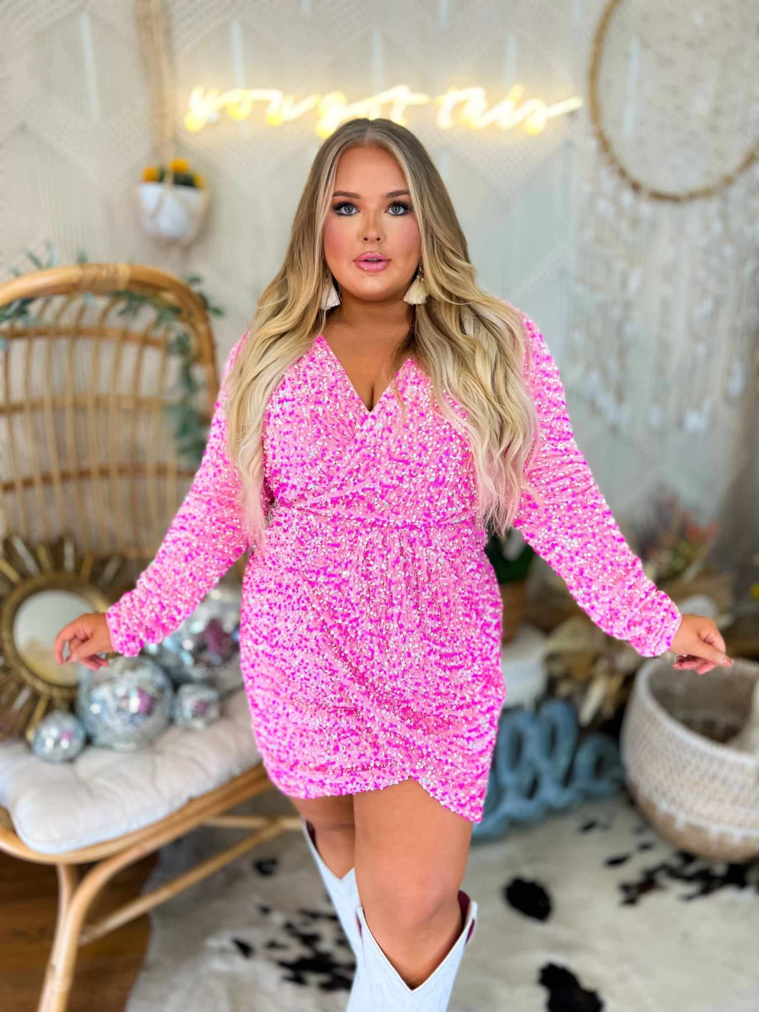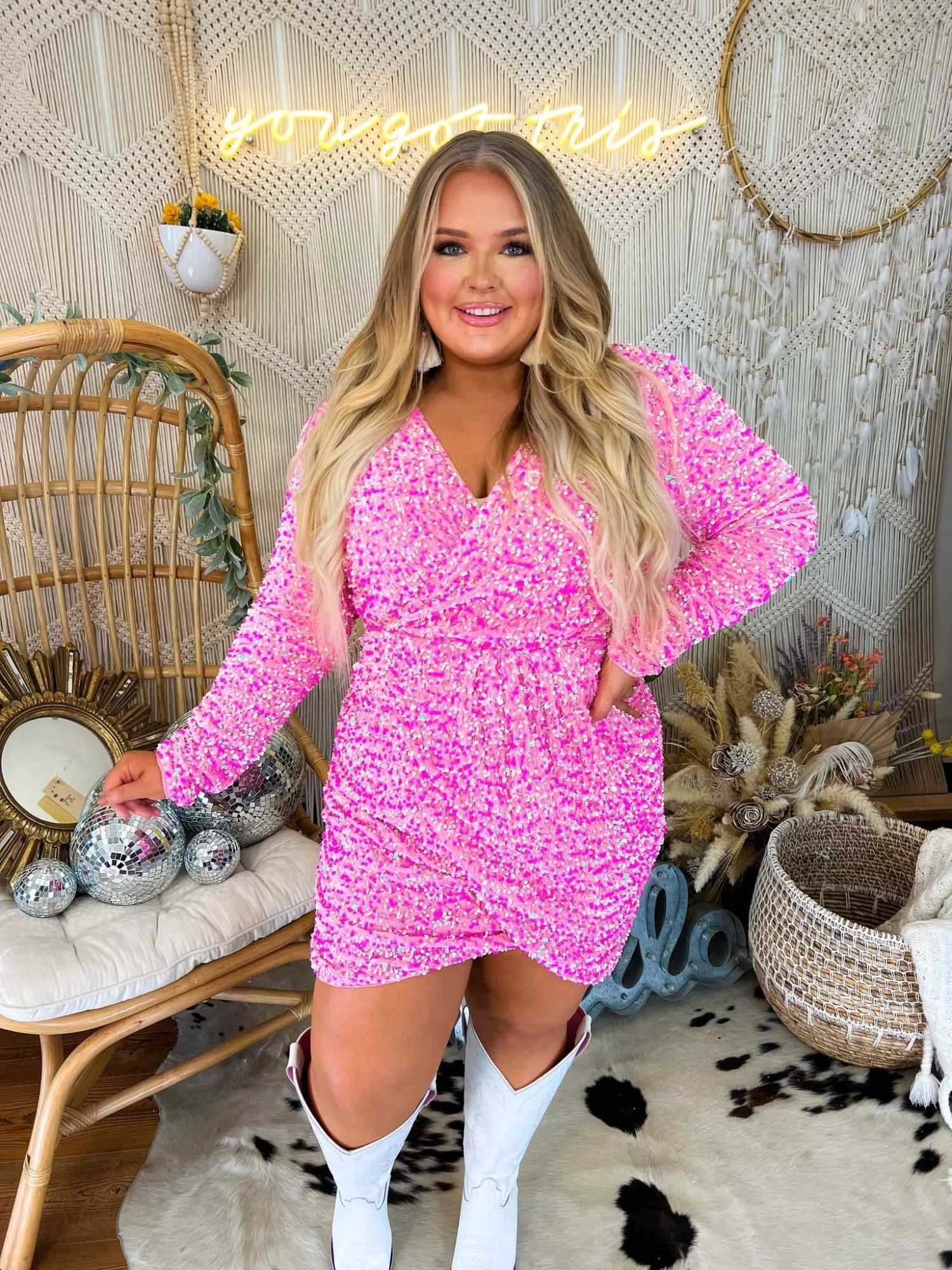 When you’re wearing this dazzling pink sequin cocktail dress, every hour is happy hour! Featuring a v-neck wrap top, long sleeves and a tulip style skirt, this pink mini dress is the ultimate in barbie core!