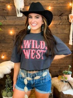 It just got a little more Western with this crop top! Soft cotton blend tee with a fun bold graphic “Wild West” screen printed on the front. This cropped tee has a crew neckline with short sleeves and a relaxed silhouette that ends in a rhinestone fringe hemline. Pairs perfectly with your cowgirl boots!Â